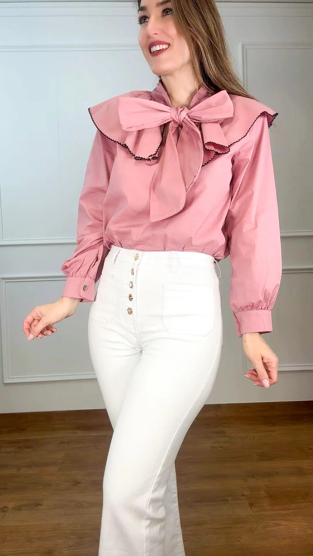 Nuestra Blusa Piera rosa con detalle de baberola y lazada es la definición perfecta de feminidad y sofisticación. Su diseño romántico resalta gracias a la delicada baberola que aporta textura y elegancia, mientras que la lazada en el cuello añade un toque refinado y versátil que puedes llevar suelto o en un lazo protagonista.